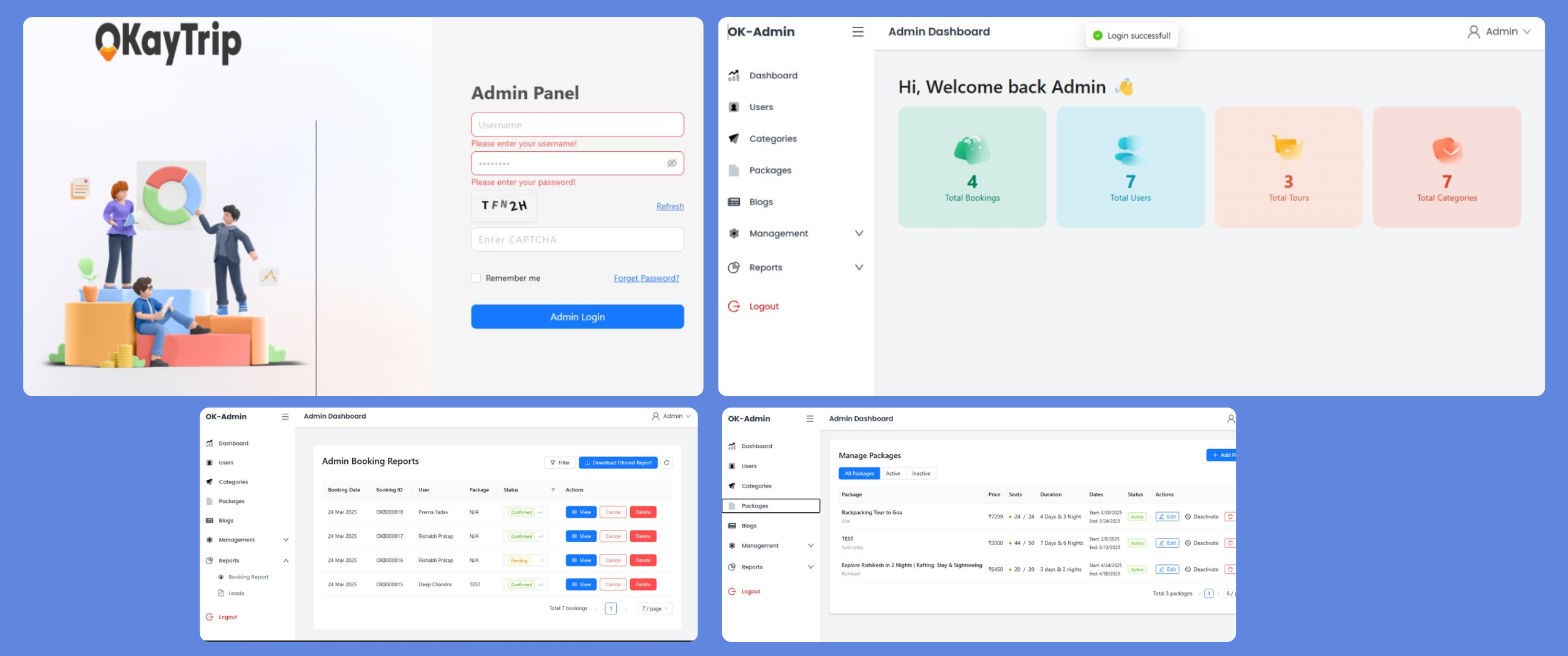 The “Custom Dashboard Development Project” for OkayTrip.in was conceptualized to empower the client with a centralized, flexible, and scalable admin panel—designed to simplify backend operations and enhance user data management in real-time. The aim was to build a dashboard that adapts to their growing travel platform and aligns with their operational goals.